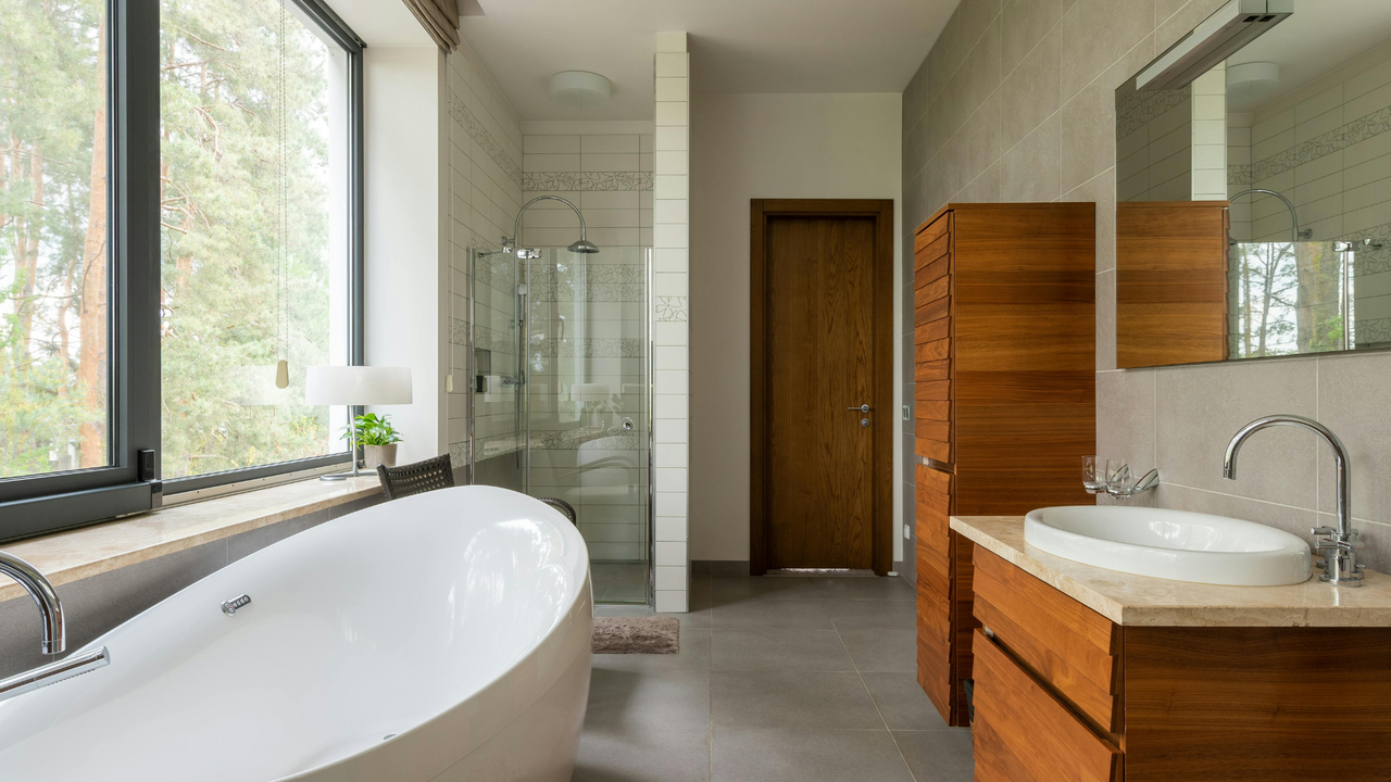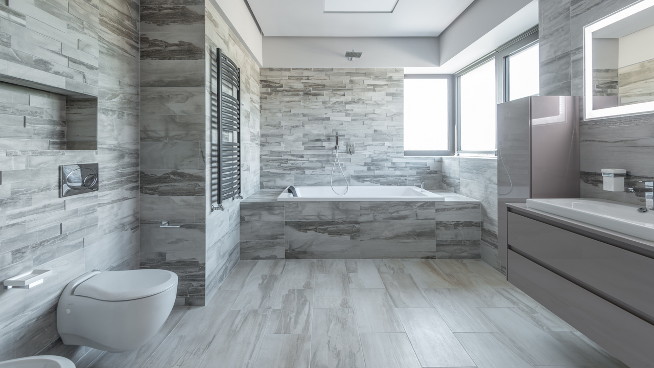 Komplett gefliestes Badezimmer mit Badewanneneinfassung